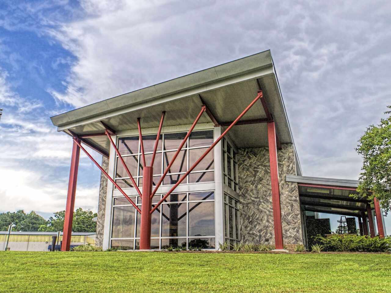 Again, drawing upon the surrounding deep southern culture, oyster-filled gabion walls are used to create an entryway for patrons which then leads the way into the large, open exhibition area. Once inside, visitors are invited to meander through the displays and interact with numerous kiosks which detail the parish’s rich history, making note various remarkable points of interest and places to visit within Terrebonne Parish. Here is where the facility provides both permanent and temporary exhibition spaces in addition to spacious conferencing and gathering areas. Throughout the building, visitors are treated to numerous architectural elements which add elements of whimsy and character to the facility, such as the pirogue sinks found within the restrooms. The adjacent visitor’s center was recently renovated to include an elevator, offices upon the second level, as well as other interior modifications.